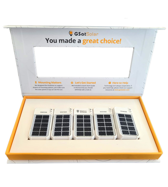 Each GSatSolar device requires no charging, as it is powered by the solar panel on the surface of each unit. A full charge is possible with normal daily sunlight, and is good enough to allow the device to report 10 times before needing more power.