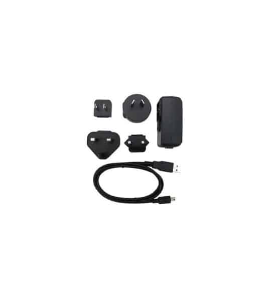 Comes with AU, EU, US, UK interchangeable plugs & USB A to Mini B cable